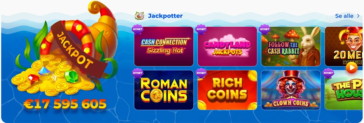 Vi tilbyr ogsÄ progressive jackpot-spill hvor du kan vinne millioner. Mega Moolah og Divine Fortune er blant vÄre mest populÊre jackpot-automater.